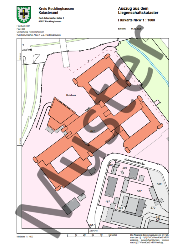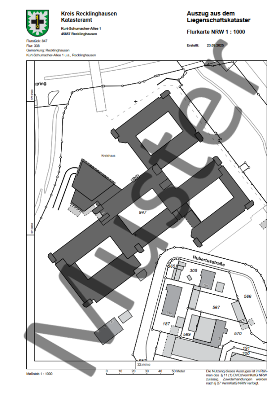 Die Flurkarte als amtlicher Auszug aus den Liegenschaftskarten kann ohne Darlegung eines Berechtigten Interesses im Maßstab 1:500, 1:1.000 oder 1:2.000 erworben werden.
